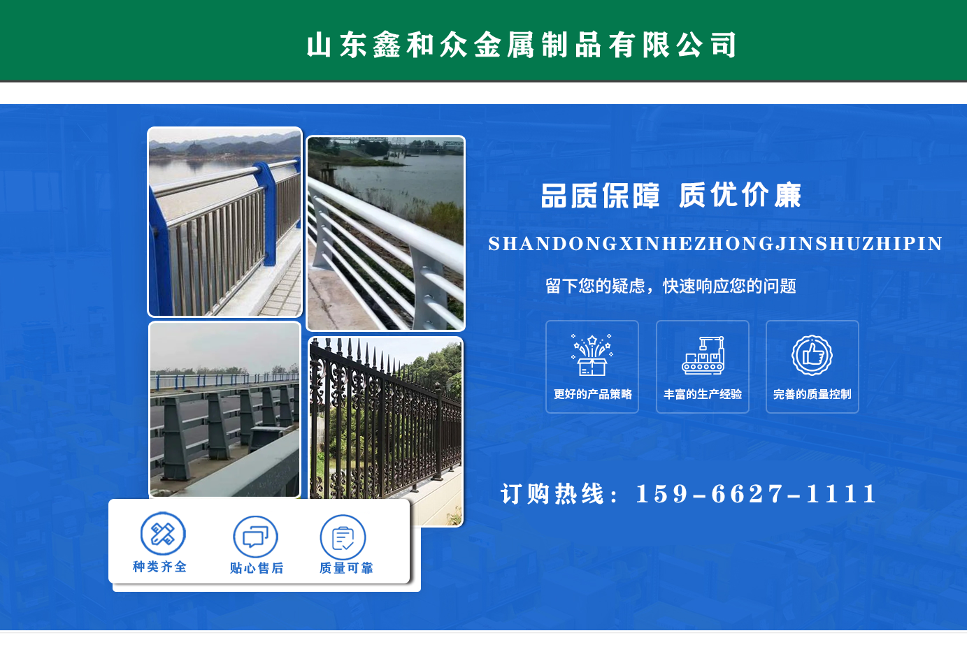 山東鑫和眾金屬制品有限公司主要產品有防撞護欄,橋梁護欄,道路護欄,河道護欄,不銹鋼護欄等護欄。提供設計方案,一站式定制,包您滿意價格優(yōu)惠,歡迎來電咨詢!    公司常年從事銷售護欄防撞護欄,橋梁護欄,道路護欄,河道護欄,不銹鋼護欄,橋梁鋼護欄,河道燈光護欄等。產品廣泛應用于橋梁、河道、旅游景區(qū)、道路、公路、公園、小區(qū)、景觀、道路防撞等領域。    公司產品均采用優(yōu)質不銹鋼材料,符合相關標準。各種型號不銹鋼復合管及護欄,質量嚴格把控。產品強度高、耐腐蝕、焊接牢固、抗沖擊、性能好,防撞護欄結構簡單、美觀實用大方。     歡迎前來訂購!...